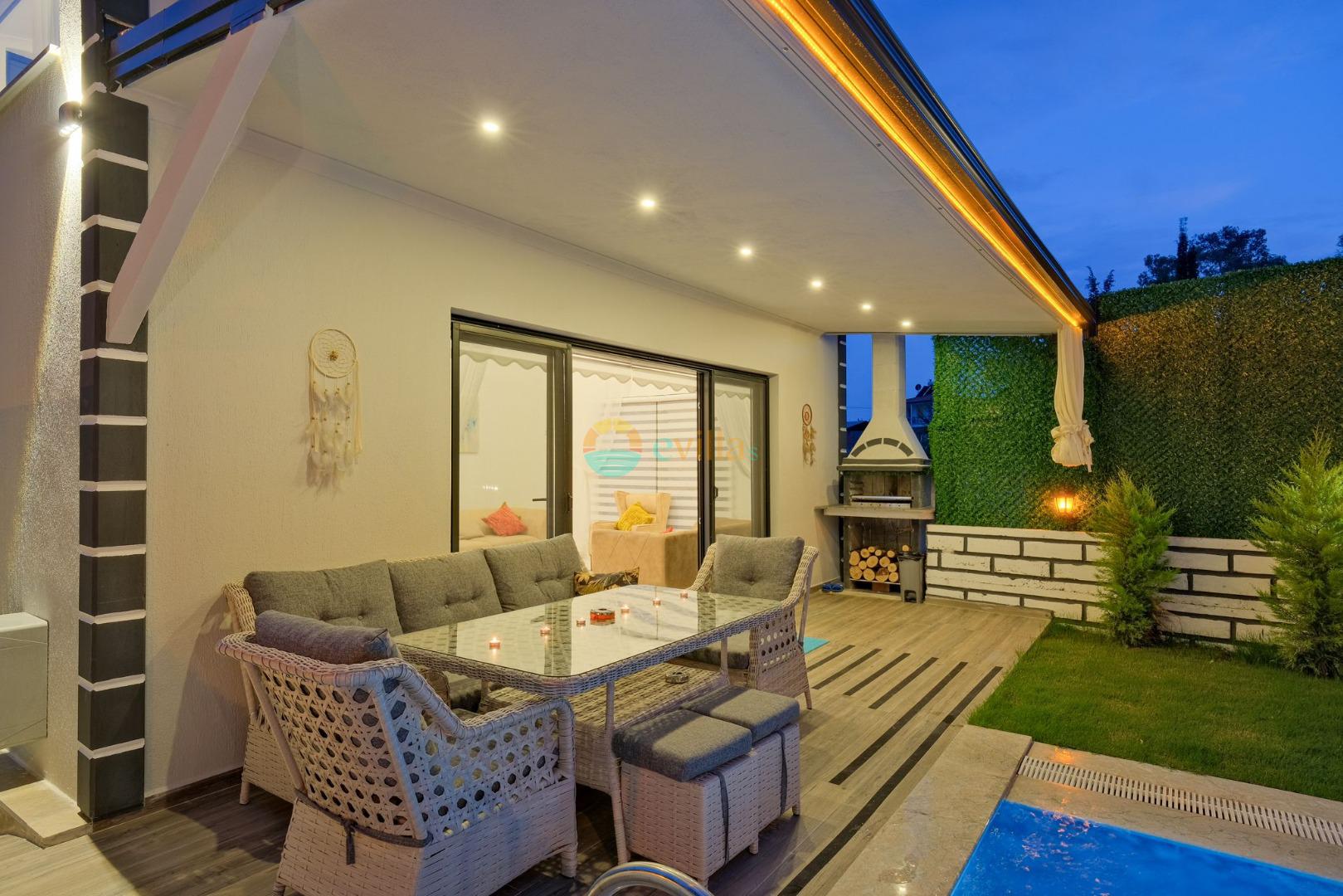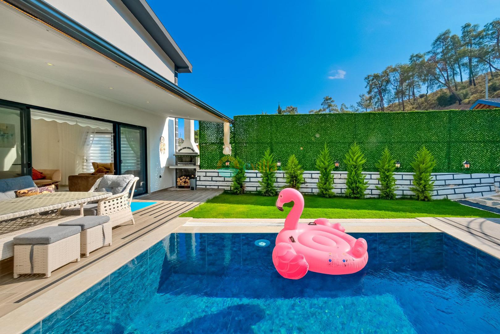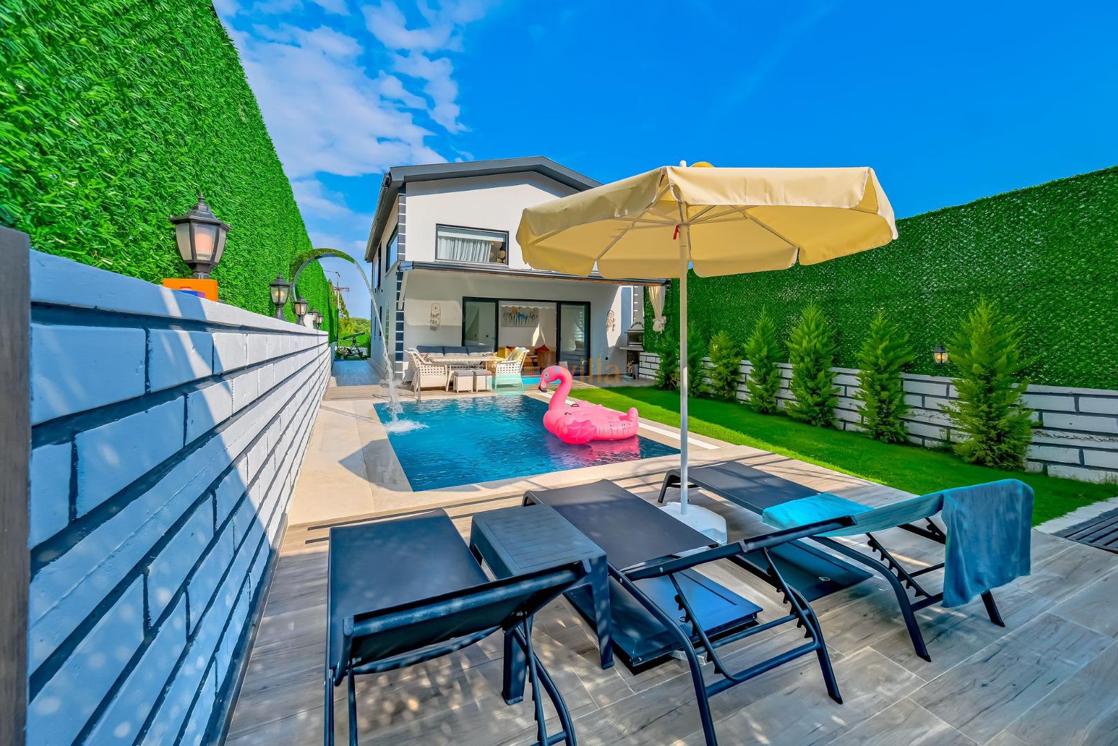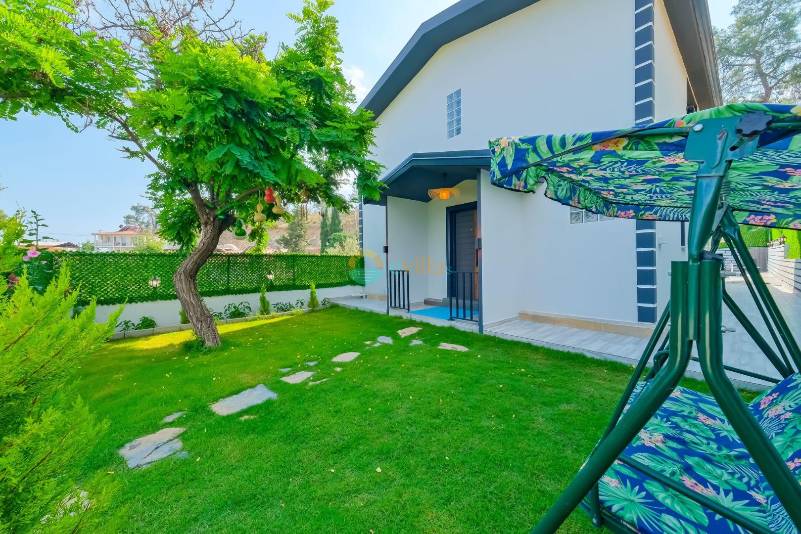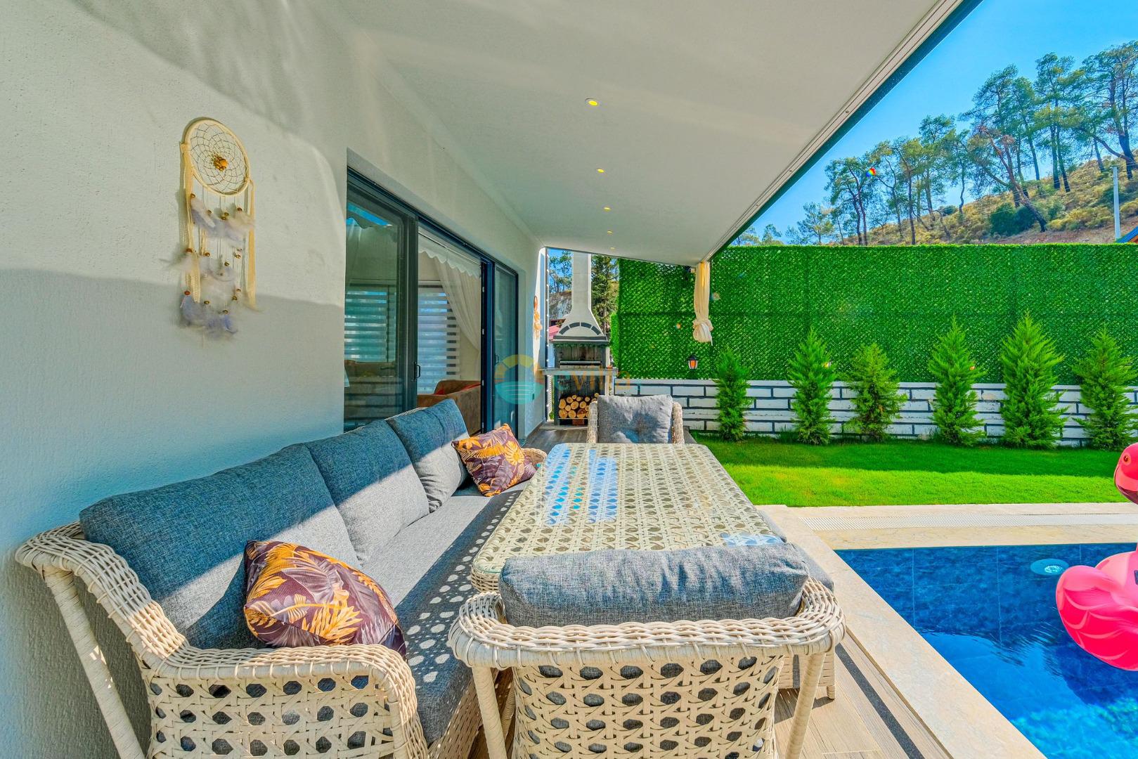 Es erwartet Sie ein besonderes Urlaubserlebnis, das Ruhe und Komfort in der herrlichen Natur von Fethiye vereint. Unsere Villa liegt in einer ruhigen Umgebung umgeben von natürlicher Schönheit und ist mit ihren geräumigen und komfortablen Räumen eine ideale Option für ihre Gäste. Die Villa verfügt über einen Sitzbereich entsprechend der Kapazität, ein Sonnenliegenset, eine Schaukel, einen Grillplatz; Es verfügt über ein gemütliches Wohnzimmer mit Zugang zur Poolterrasse, eine gut ausgestattete Küche, die Ihren Bedürfnissen gerecht wird, und ein Gemeinschaftsbad. Das erste Schlafzimmer hat ein Doppelbett; das zweite Schlafzimmer hat zwei Einzelbetten; Das dritte Schlafzimmer hat ein Doppelbett und ein Badezimmer.