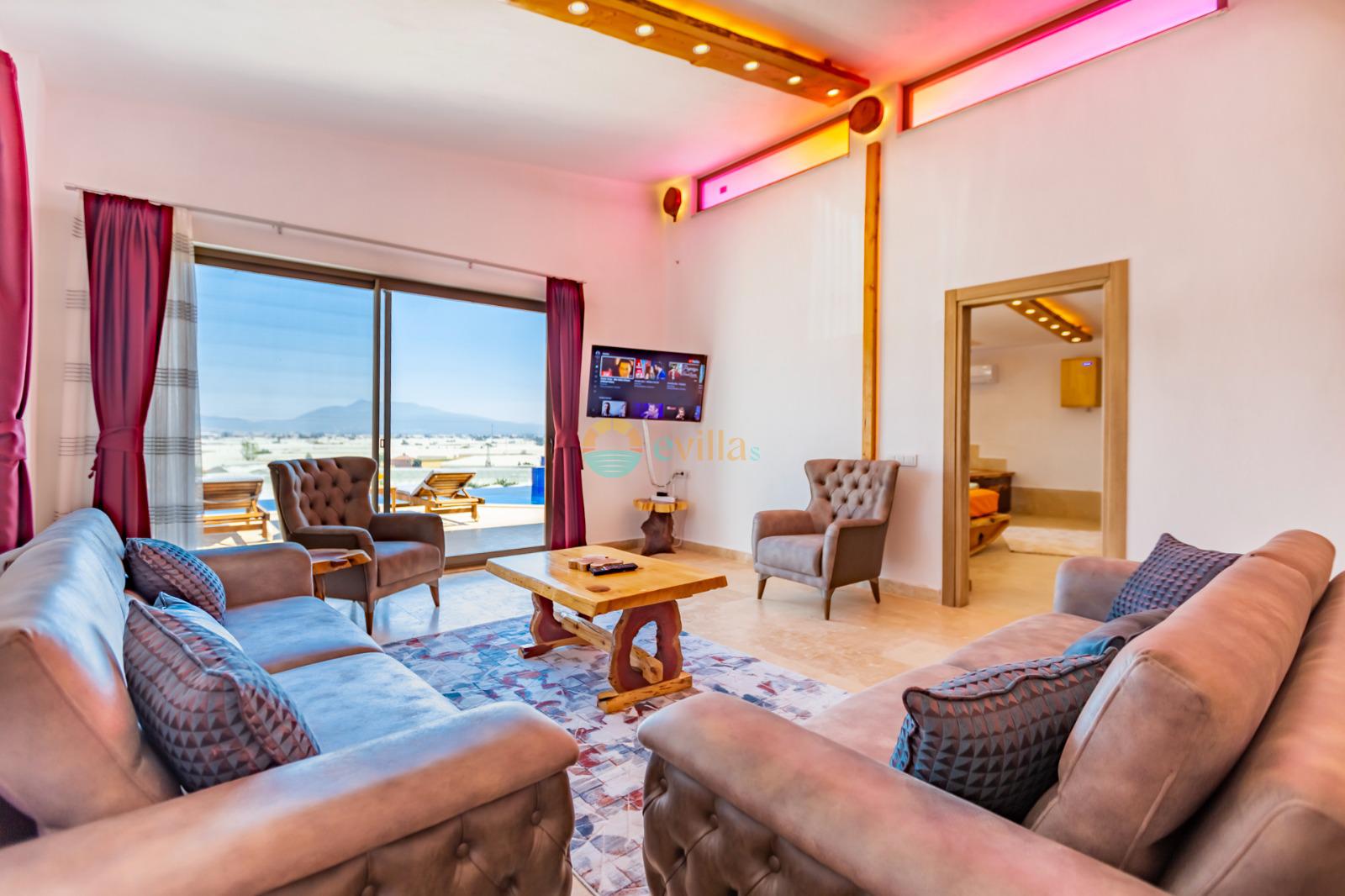 Im Wohnzimmer, das als Gemeinschaftsbereich dient, gibt es eine Küche und einen Ruhe-Sitzbereich, eine moderne Sofagarnitur, einen Großbildfernseher, direkt neben dem Swimmingpool, mit herrlichem Blick auf die Natur und das Meer vom Wohnzimmer aus zugänglich.