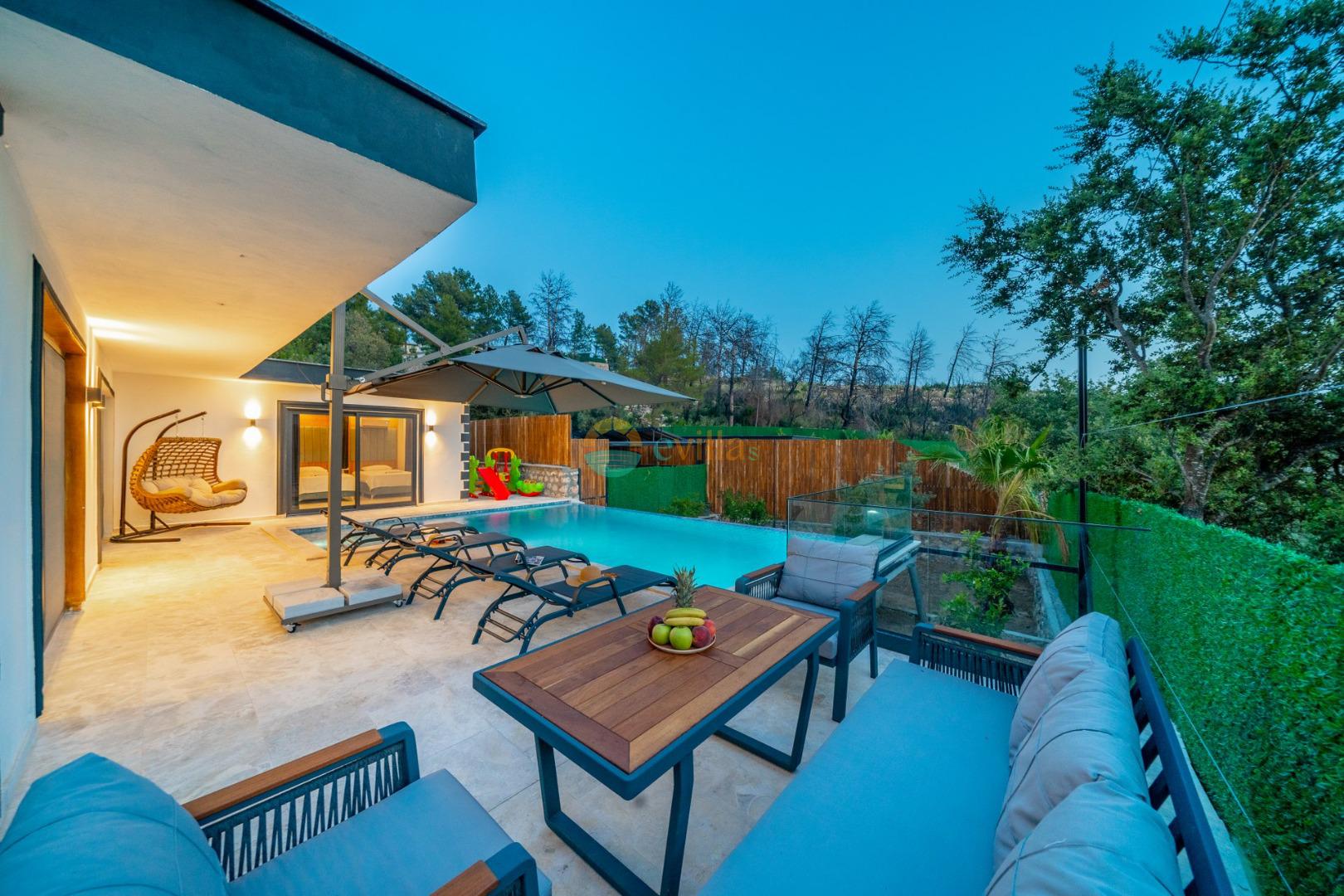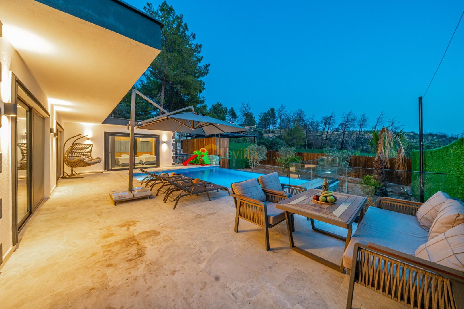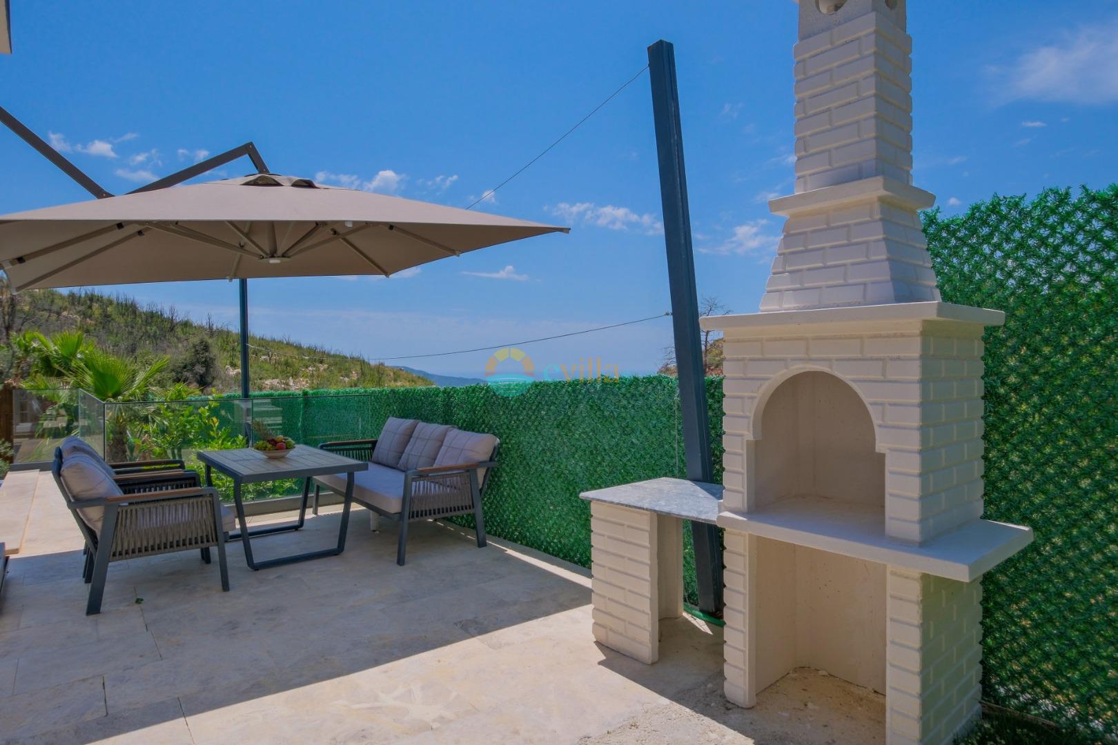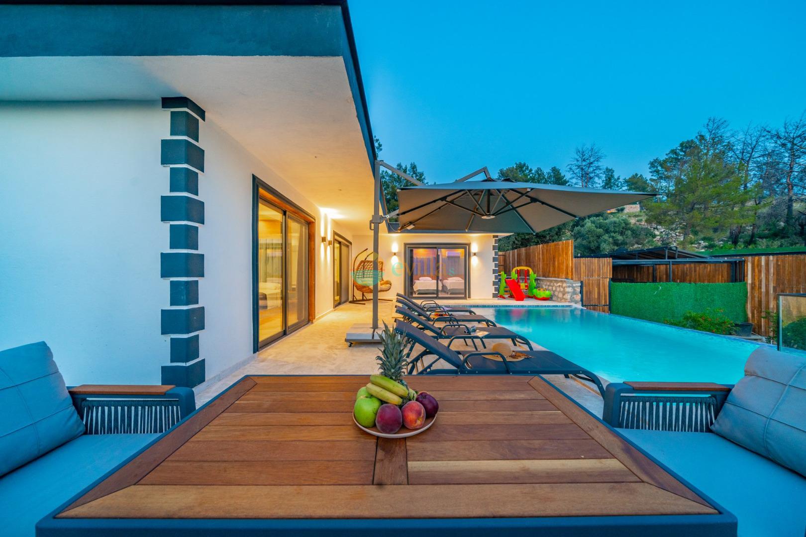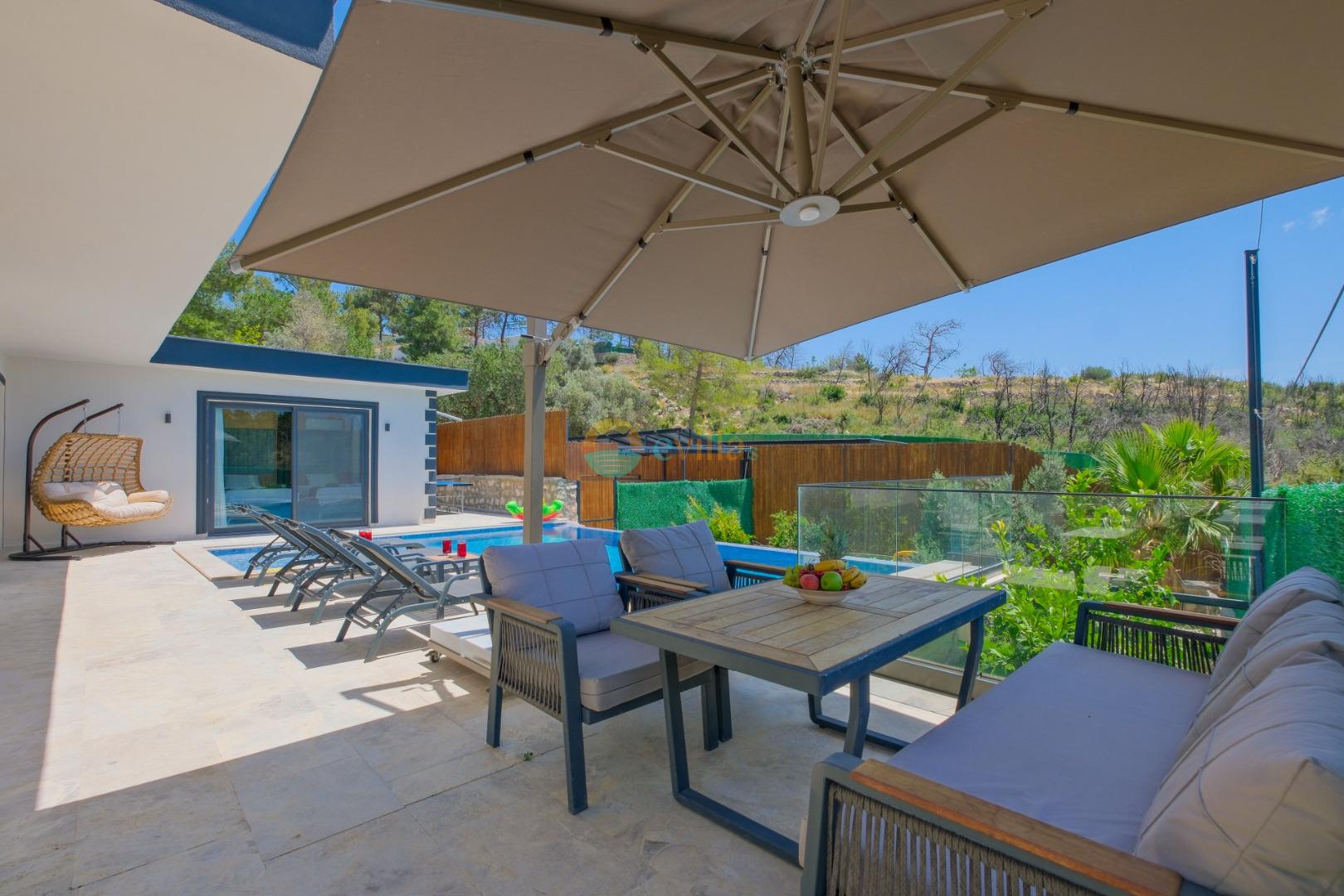 Es handelt sich um eine Honeymoon- und Ferienvilla, die sich in Üzümlü bei Kalkan inmitten der Natur befindet.