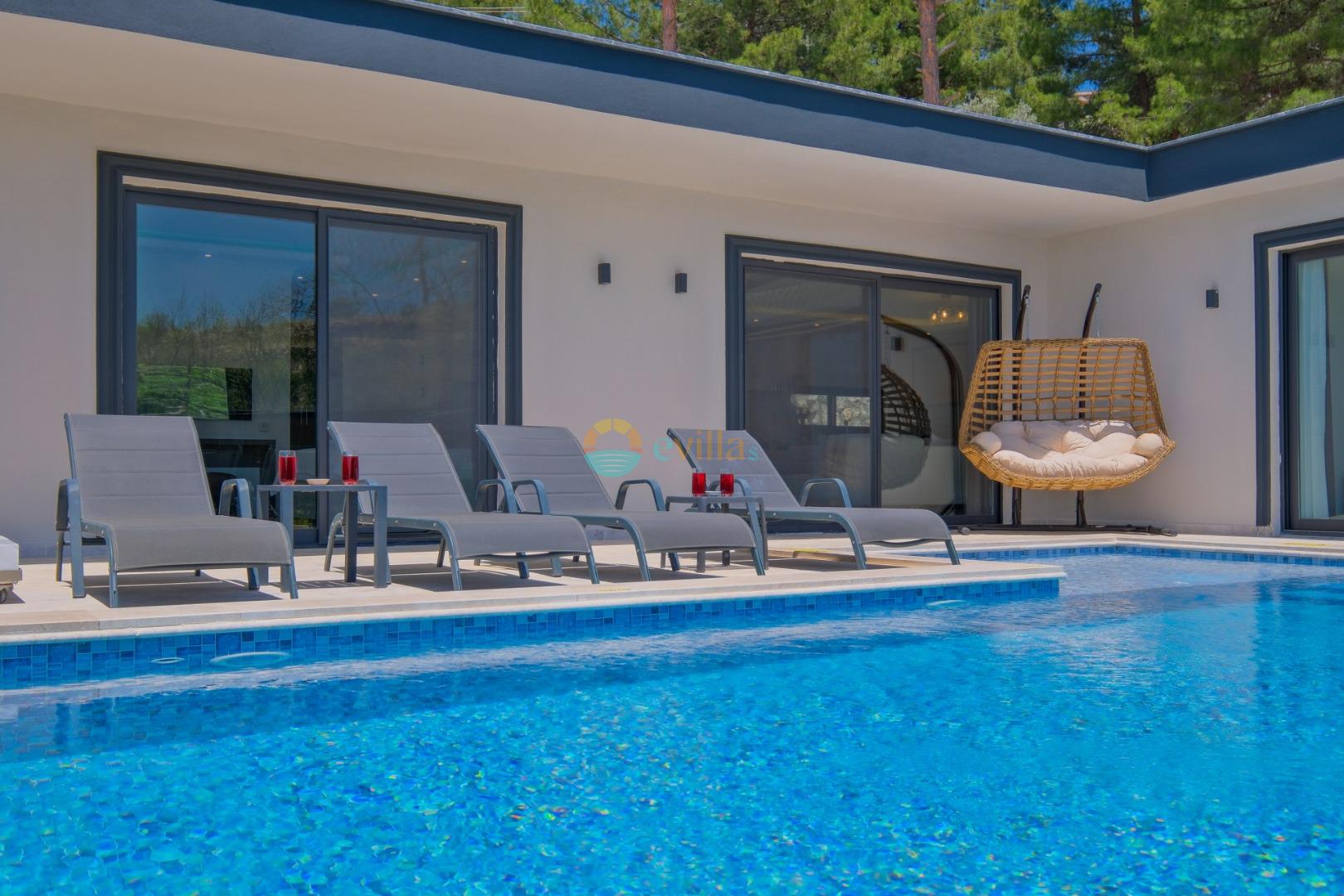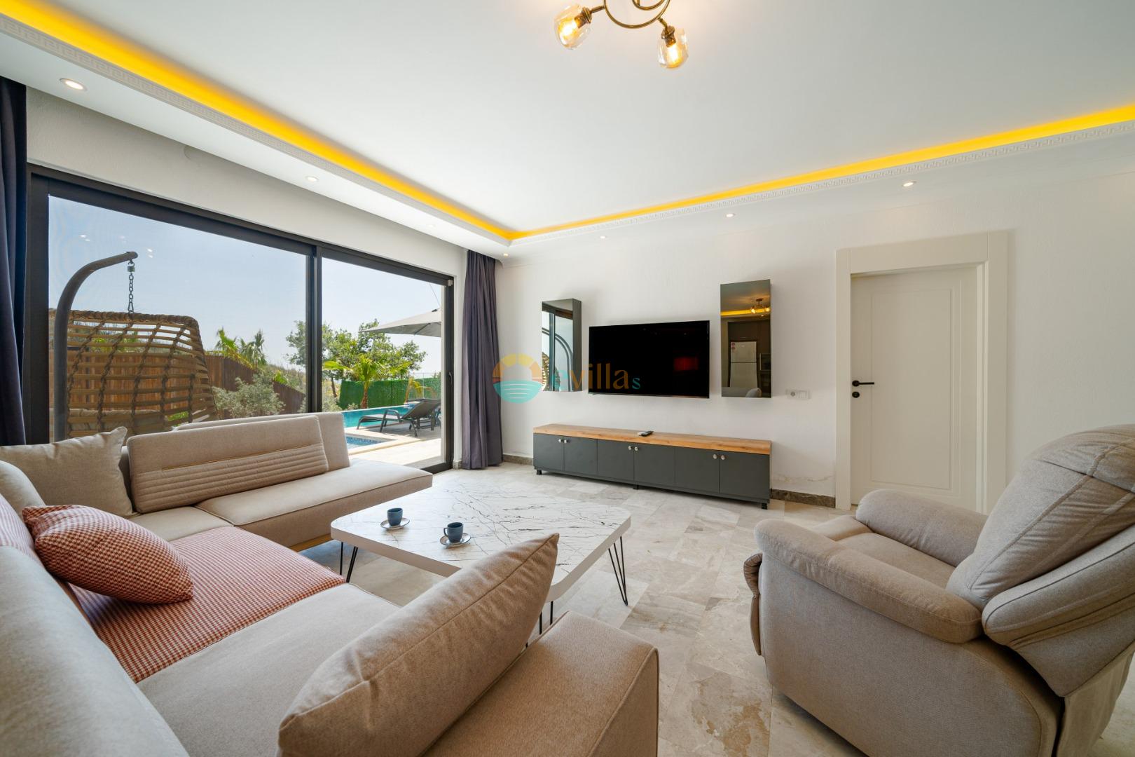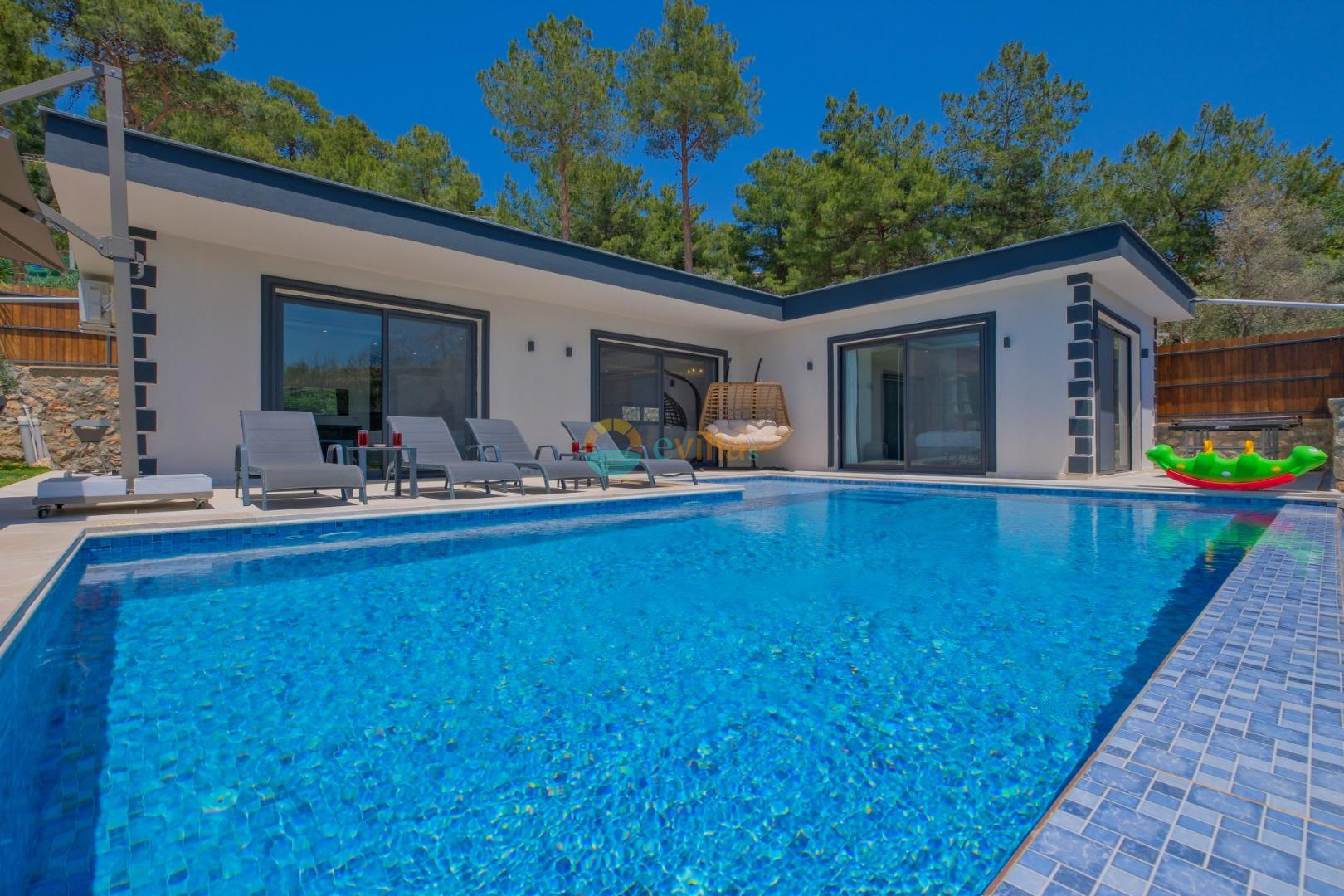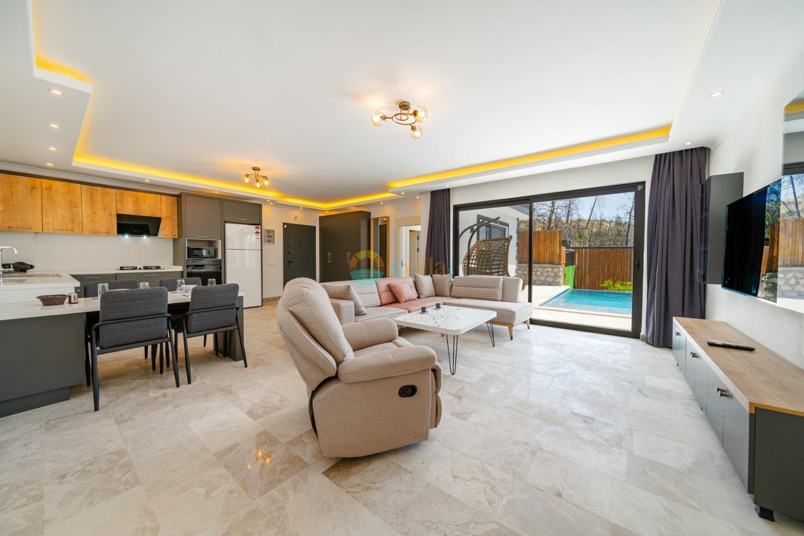 Es handelt sich um eine Honeymoon- und Ferienvilla, die sich in Üzümlü bei Kalkan inmitten der Natur befindet.