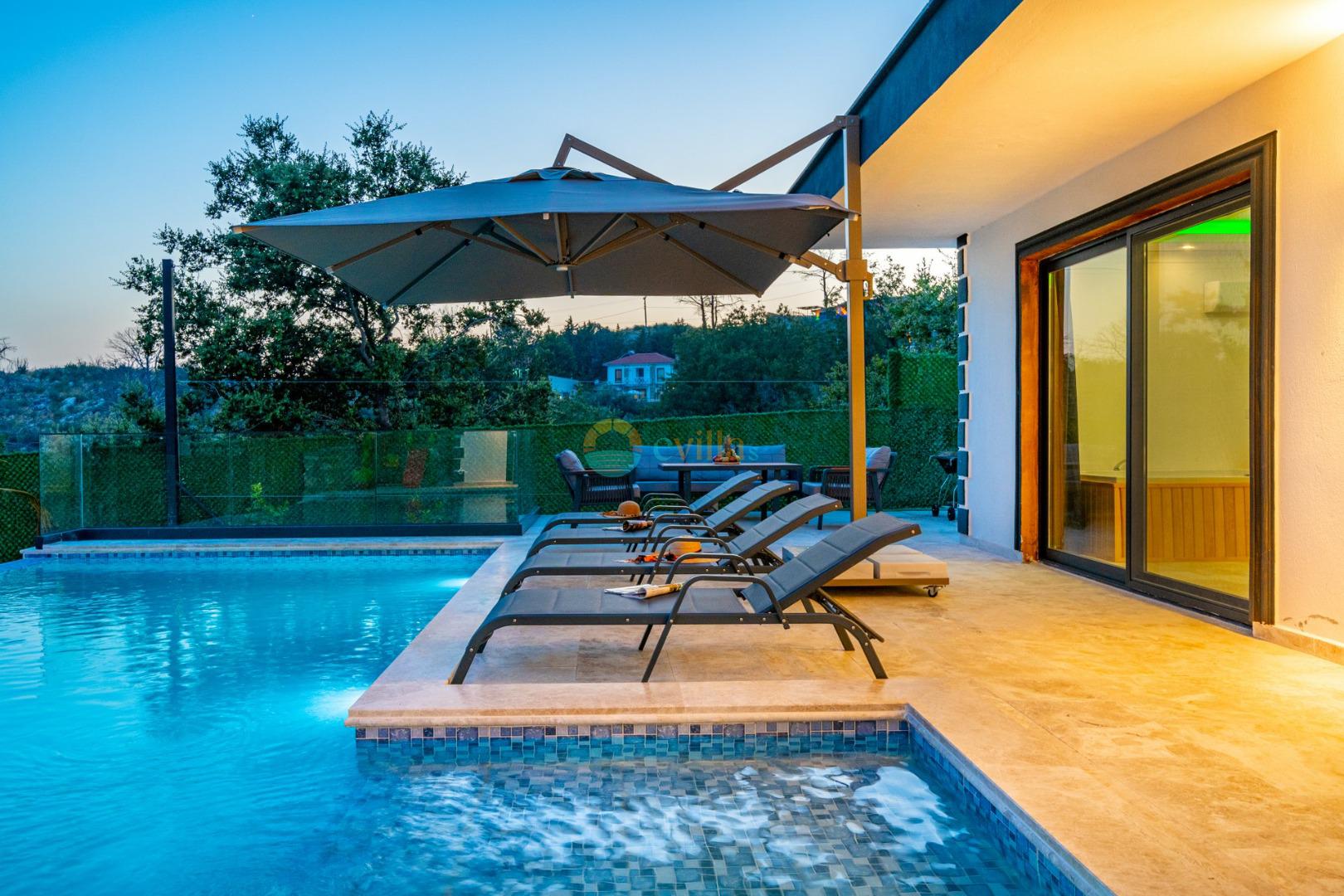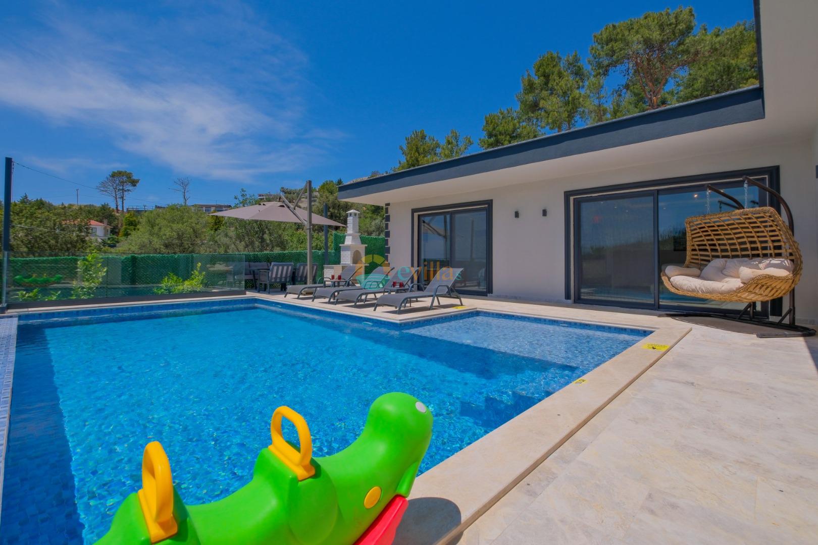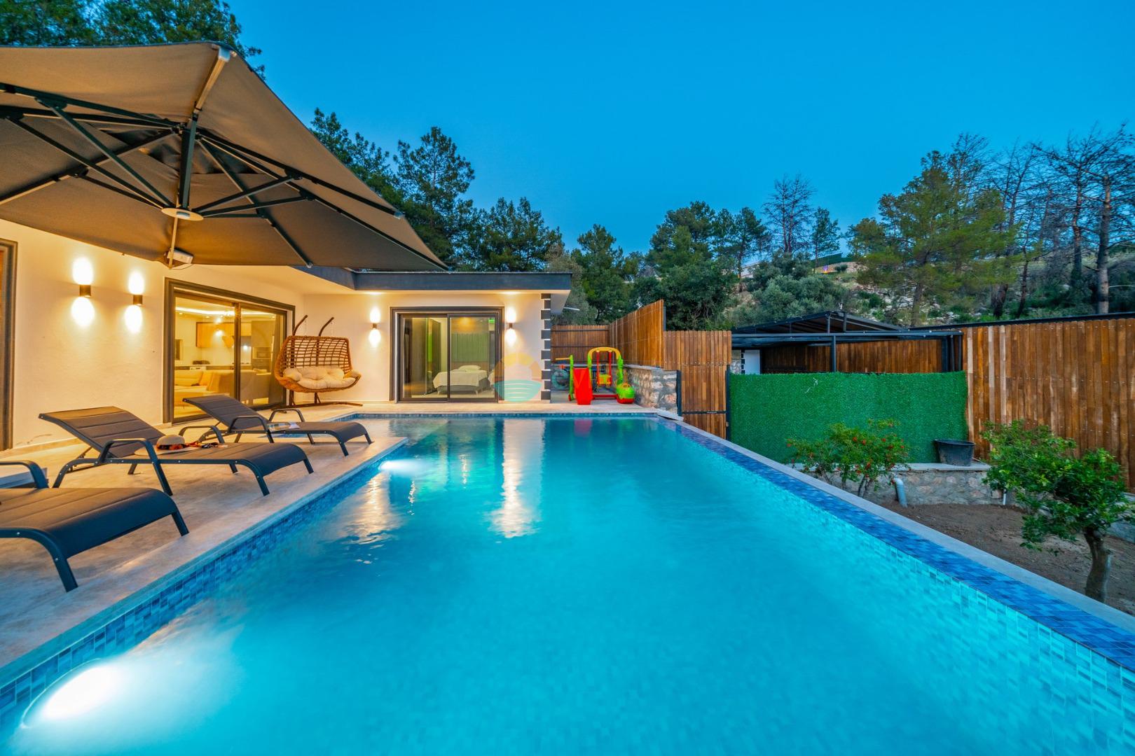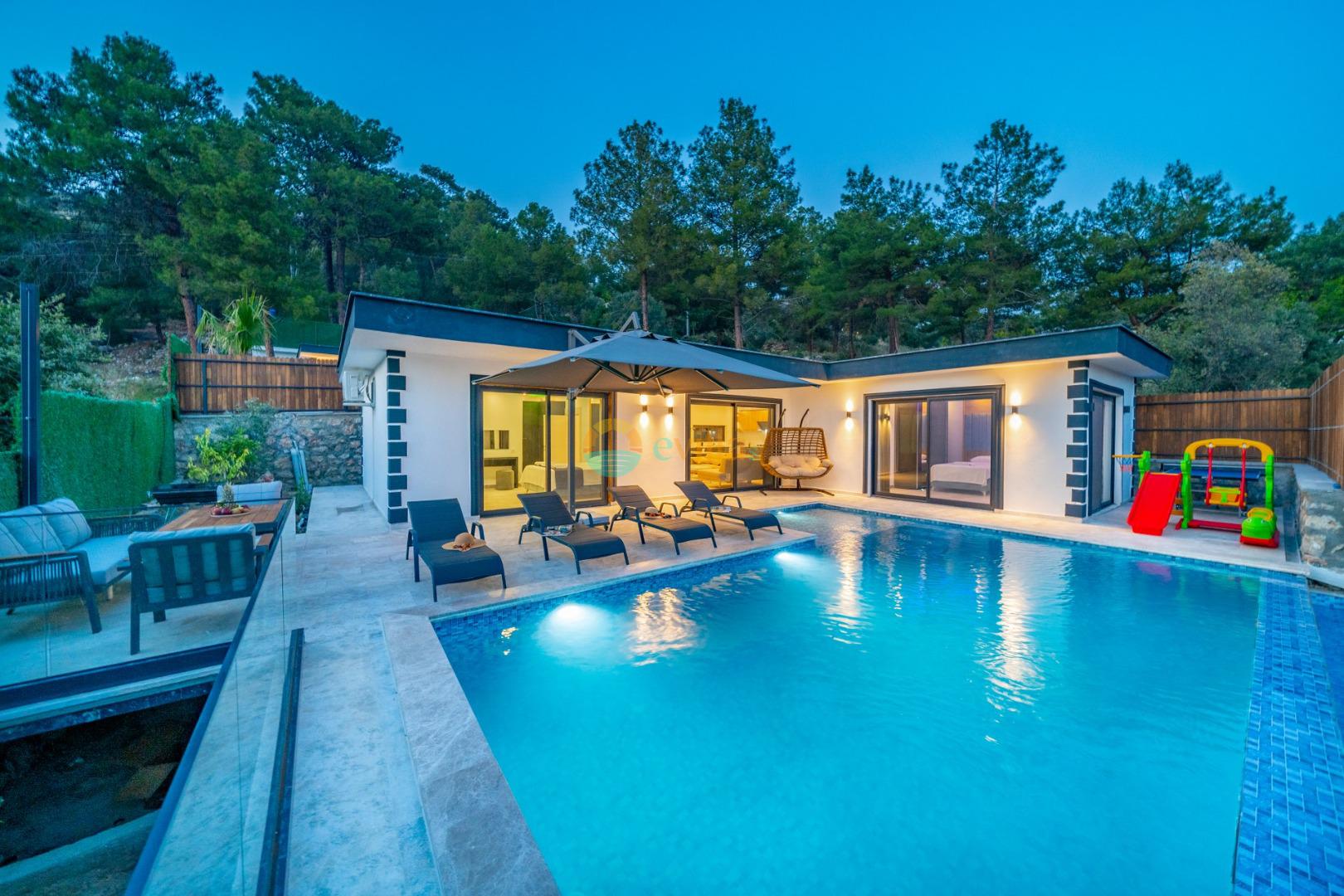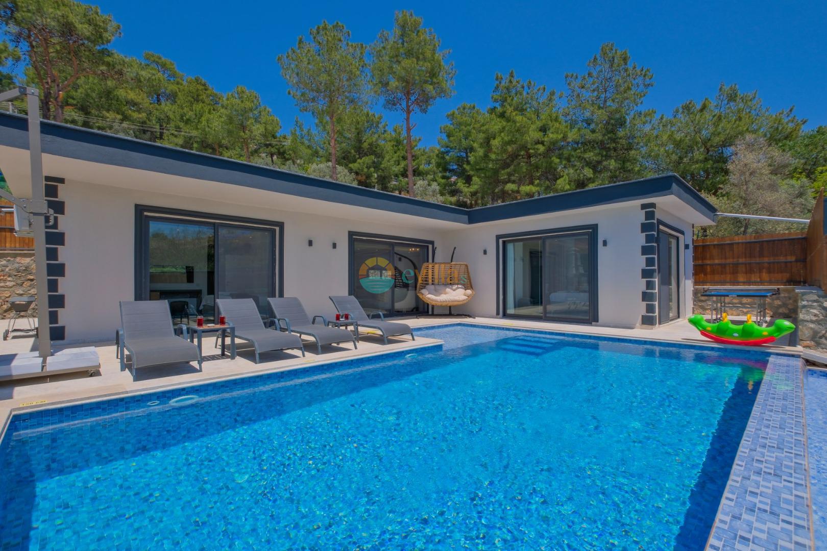 Es handelt sich um eine Honeymoon- und Ferienvilla, die sich in Üzümlü bei Kalkan inmitten der Natur befindet.