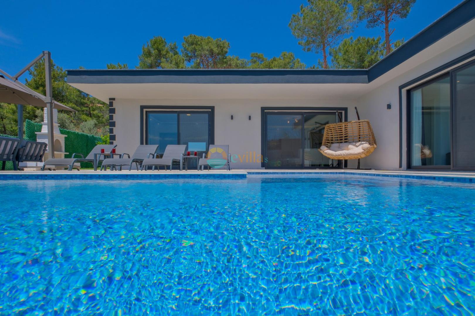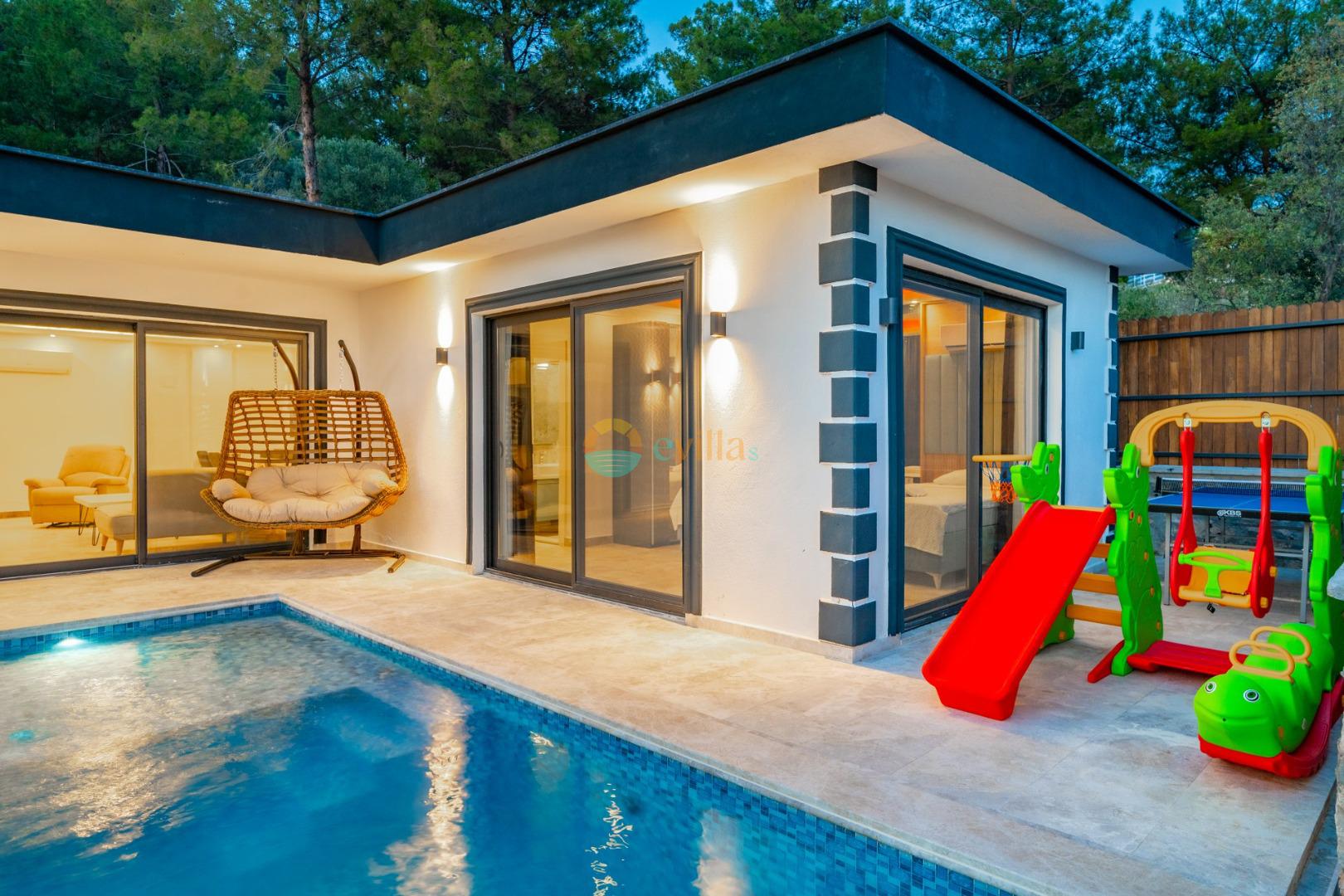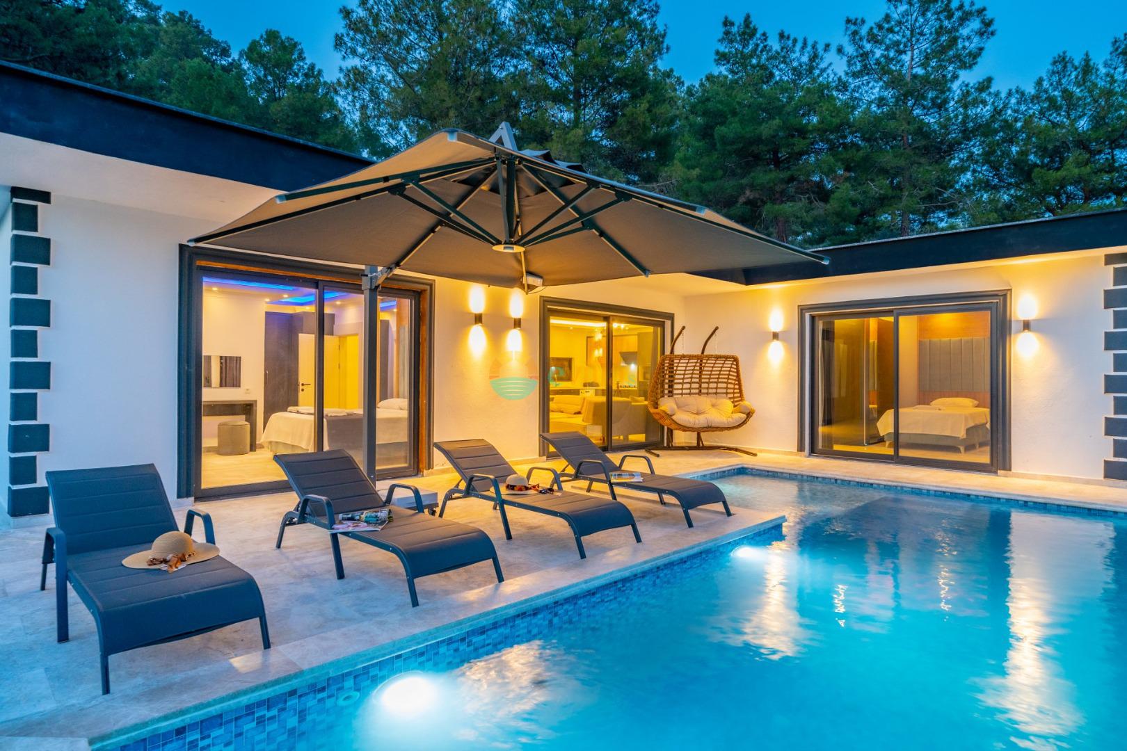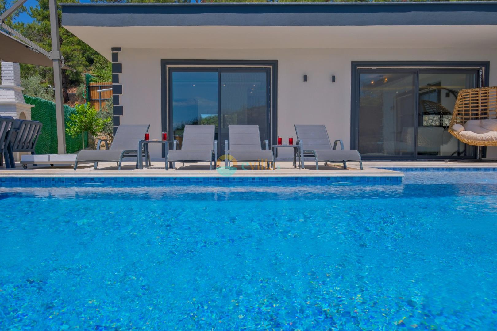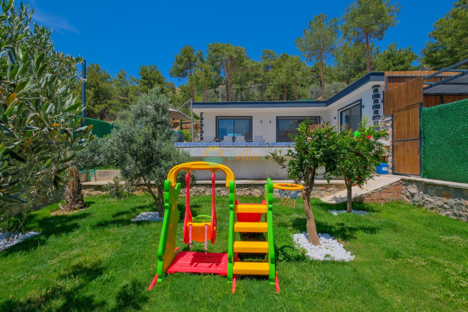 Es handelt sich um eine Honeymoon- und Ferienvilla, die sich in Üzümlü bei Kalkan inmitten der Natur befindet.