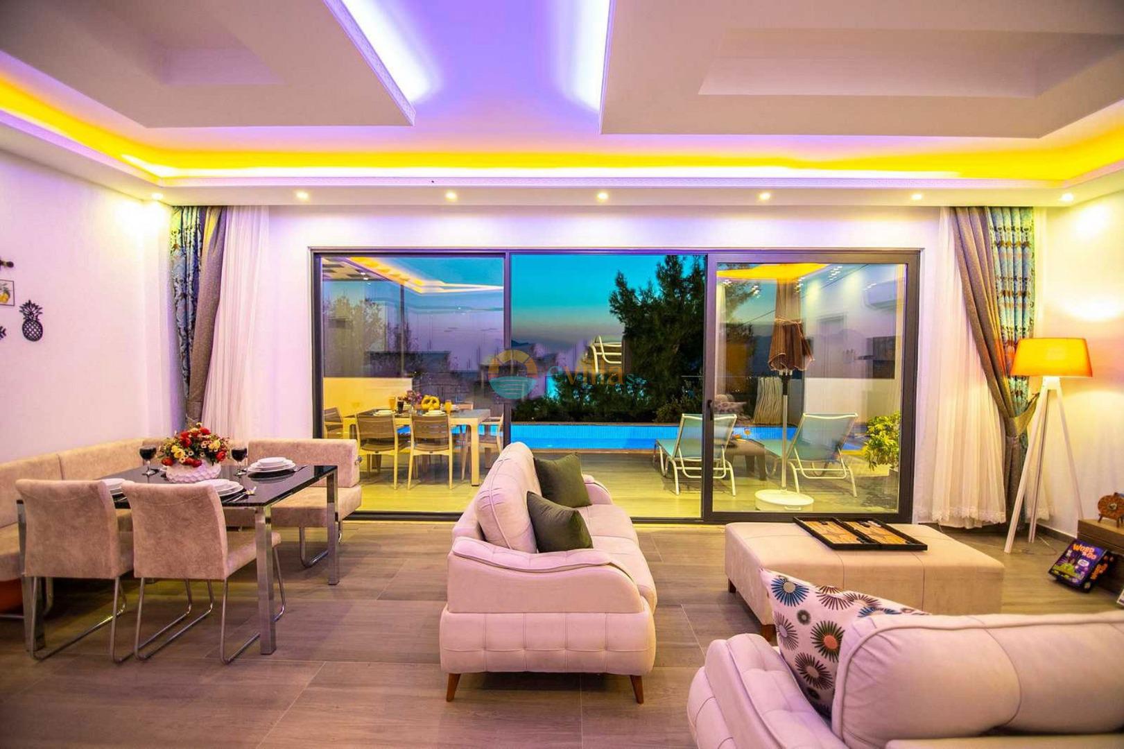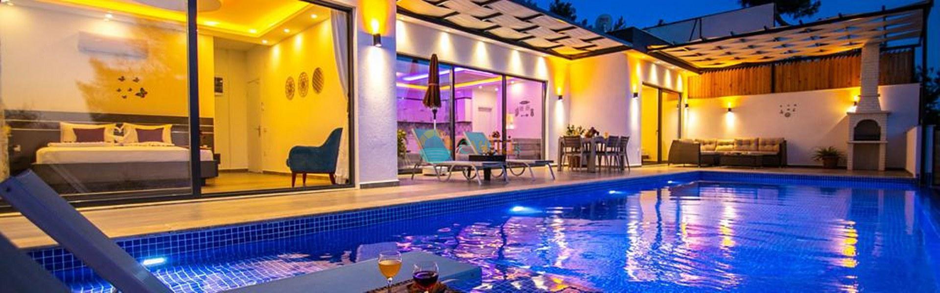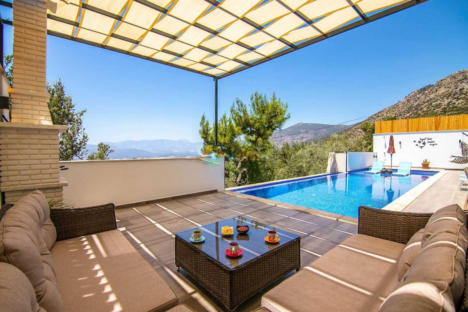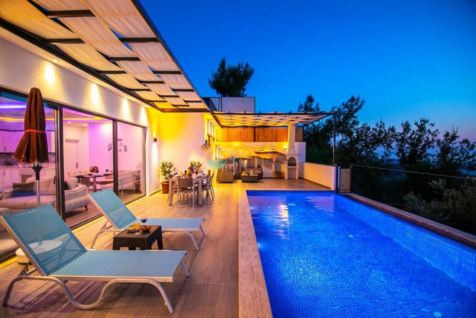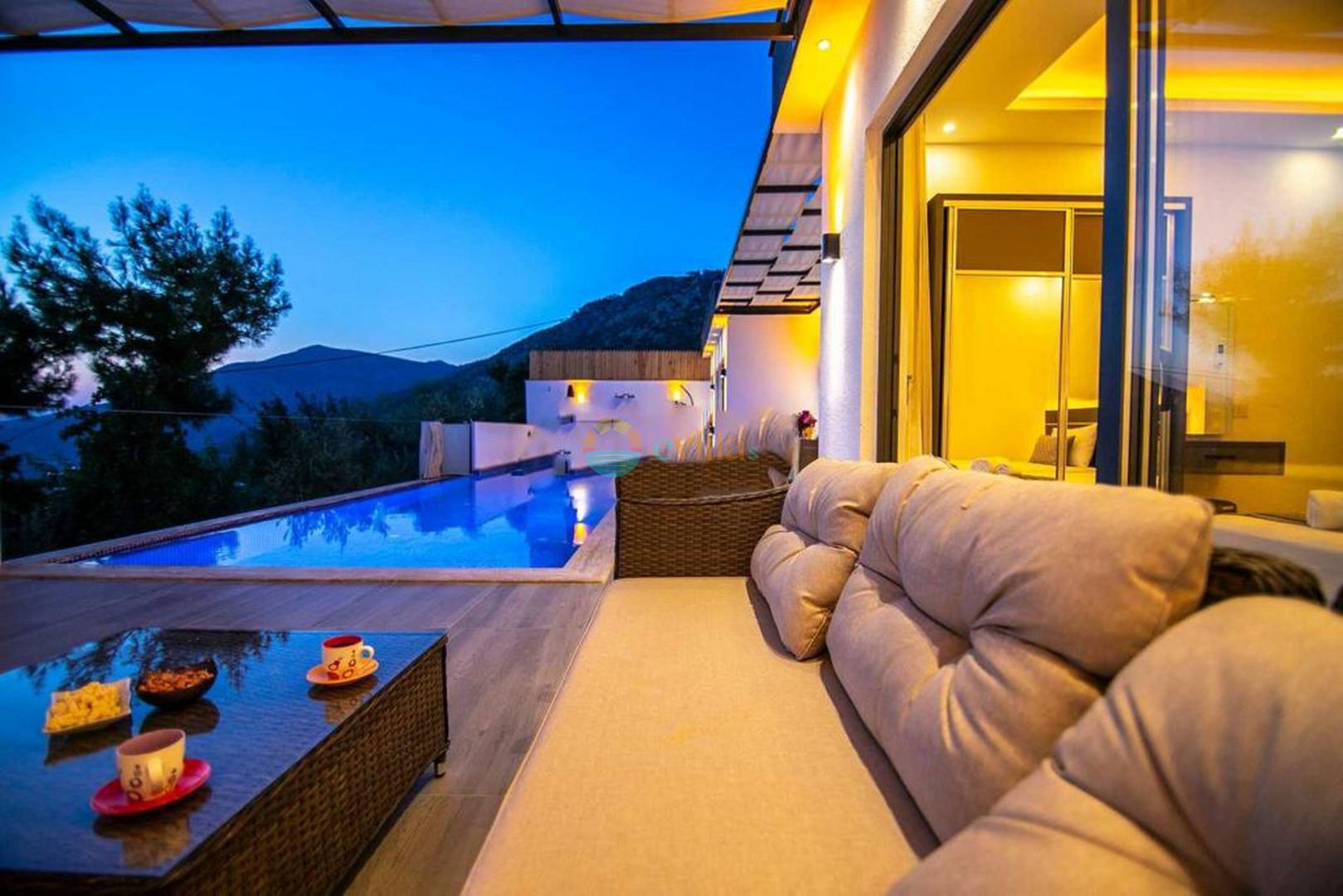 Unsere Villa befindet sich im Dorf Kalkan Üzümlü und ist eine brandneue Villa mit einem vollständig geschützten privaten Pool. Mit seiner Lage inmitten üppiger Natur und dem weiten Blick auf das Meer bietet es eine wunderbare Urlaubsmöglichkeit für konservative Familien und Flitterwochengäste. In unserer Villa mit farbenfroher und stilvoller Inneneinrichtung können Sie dank Kinoraum, Brettspielen (Molipoly, Tell Me, Ludo), Rommé-Spiel, Schach, Spielkarten und Backgammon auch Spaß mit Ihrer Familie haben.