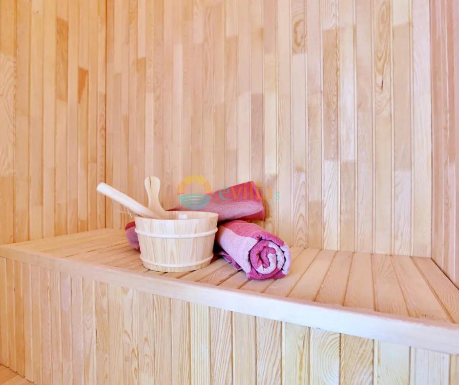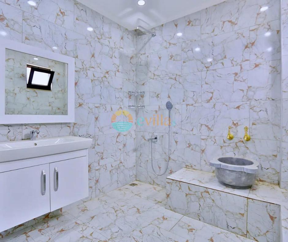 Villa zu vermieten mit Pool Kalkan Neben dem ruhigen Poolbereich verfügt die Villa über eine Außenterrasse, die einen atemberaubenden Panoramablick auf die umliegende Landschaft bietet. Diese Terrasse dient als idealer Rahmen für Mahlzeiten im Freien oder einfach zum Genießen der Schönheit der natürlichen Umgebung. Im Inneren der Villa finden die Gäste eine voll ausgestattete Küche, in der sie während ihres Aufenthalts köstliche Köstlichkeiten genießen können. Die modernen Schlafzimmer mit eigenem Bad sind auf ultimativen Komfort ausgelegt und verfügen über luxuriöse Annehmlichkeiten wie Hamam und Sauna für einen Hauch von Flair. Komfortable Wohnräume bieten eine angenehme Erholung nach einem erlebnisreichen Tag und sorgen dafür, dass sich die Gäste in dieser idyllischen Umgebung wie zu Hause fühlen.