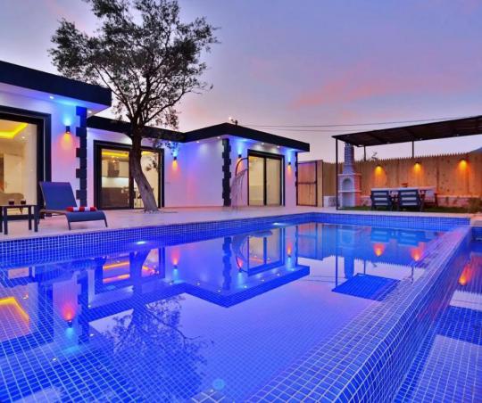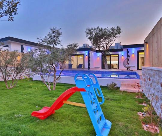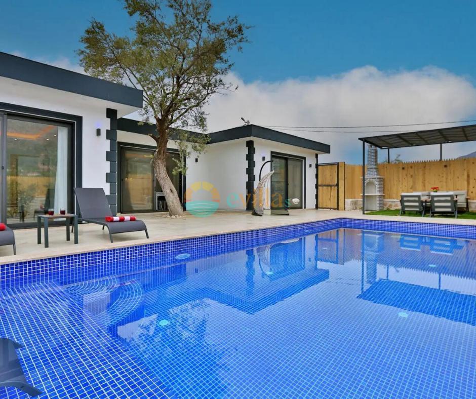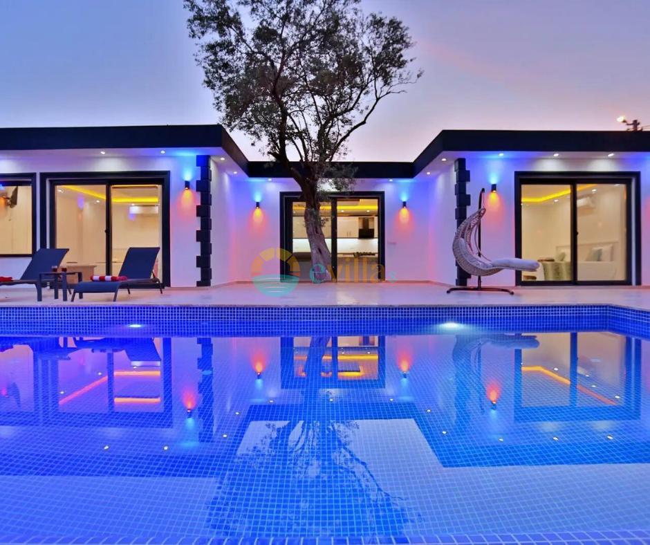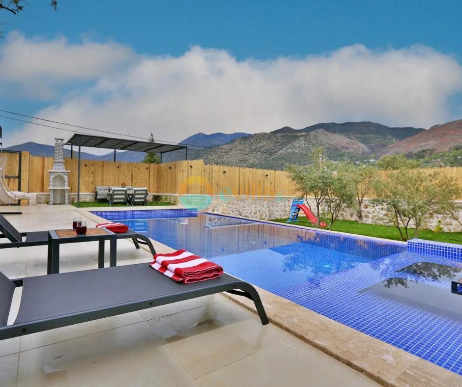 Villa zu vermieten mit Pool Unsere Villa in der Region Kalkan Üzümlü ist eine Ferienresidenz mit 2 Schlafzimmern und einer Unterkunftskapazität von 4 Personen, mit einem konservativen Swimmingpool, einer Sauna, einem Türkischen Bad und einem Whirlpool. Mit den Olivenbäumen im Inneren, mitten in der Natur und mit den luxuriösen Einrichtungen, die die Villa bietet, werden Sie sich ganz besonders fühlen. Unsere Villa ist mit ihrem privaten Swimmingpool, der großen Poolterrasse und den Rasenflächen mit Spielplatz sehr gut für Kleinfamilien geeignet. Unsere Villa, die durch ihre günstigen Preise auffällt, wartet auf ihre Gäste.