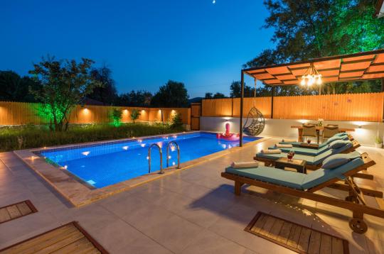 Unsere Villa ist eine moderne Mietvilla in der Region Kalkan Bezirgan und an einem mit der Natur verbundenen Ort. Mit zwei Schlafzimmern und einer Kapazität für vier Personen ist es eine ideale Option für kleine Familien oder Gruppen von Freunden. Die Innenräume der Villa sind modern und komfortabel gestaltet und so gestaltet, dass sie den Komfort und die Zufriedenheit der Gäste maximieren. Insbesondere die geschützte Poolterrasse, der private Swimmingpool und der Grillplatz der Villa bieten hervorragende Möglichkeiten für ruhige und unterhaltsame Stunden. Da diese Bereiche von natürlichen Ausblicken umgeben sind, können Sie sich entspannen und angenehme Zeiten in ruhiger Atmosphäre abseits des Chaos der Außenwelt verbringen. Diese besondere und friedliche Umgebung unserer Villa bietet ein perfektes Urlaubserlebnis für diejenigen, die eine schöne Zeit mit ihren Lieben verbringen und gleichzeitig die Natur genießen möchten. Diese Villa liegt inmitten der einzigartigen Naturschönheiten von Kalkan und ist ein idealer Ausgangspunkt zum Entspannen und Genießen der Region.