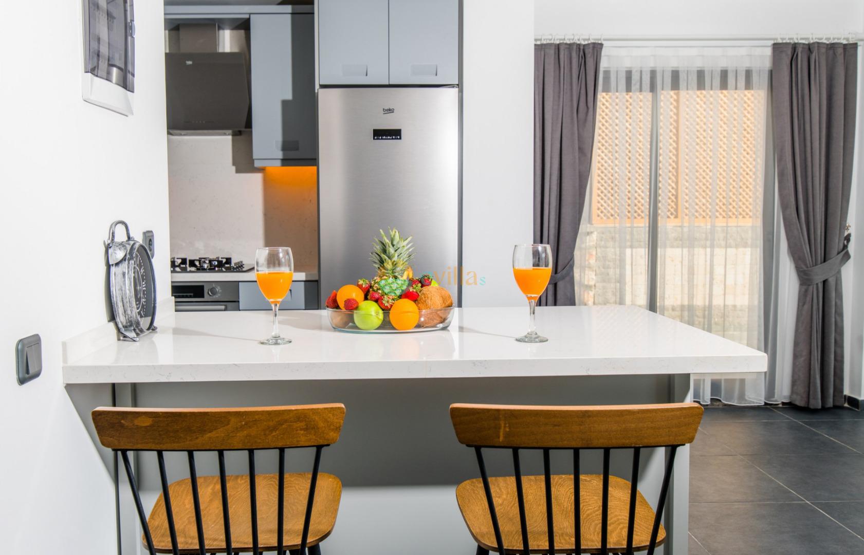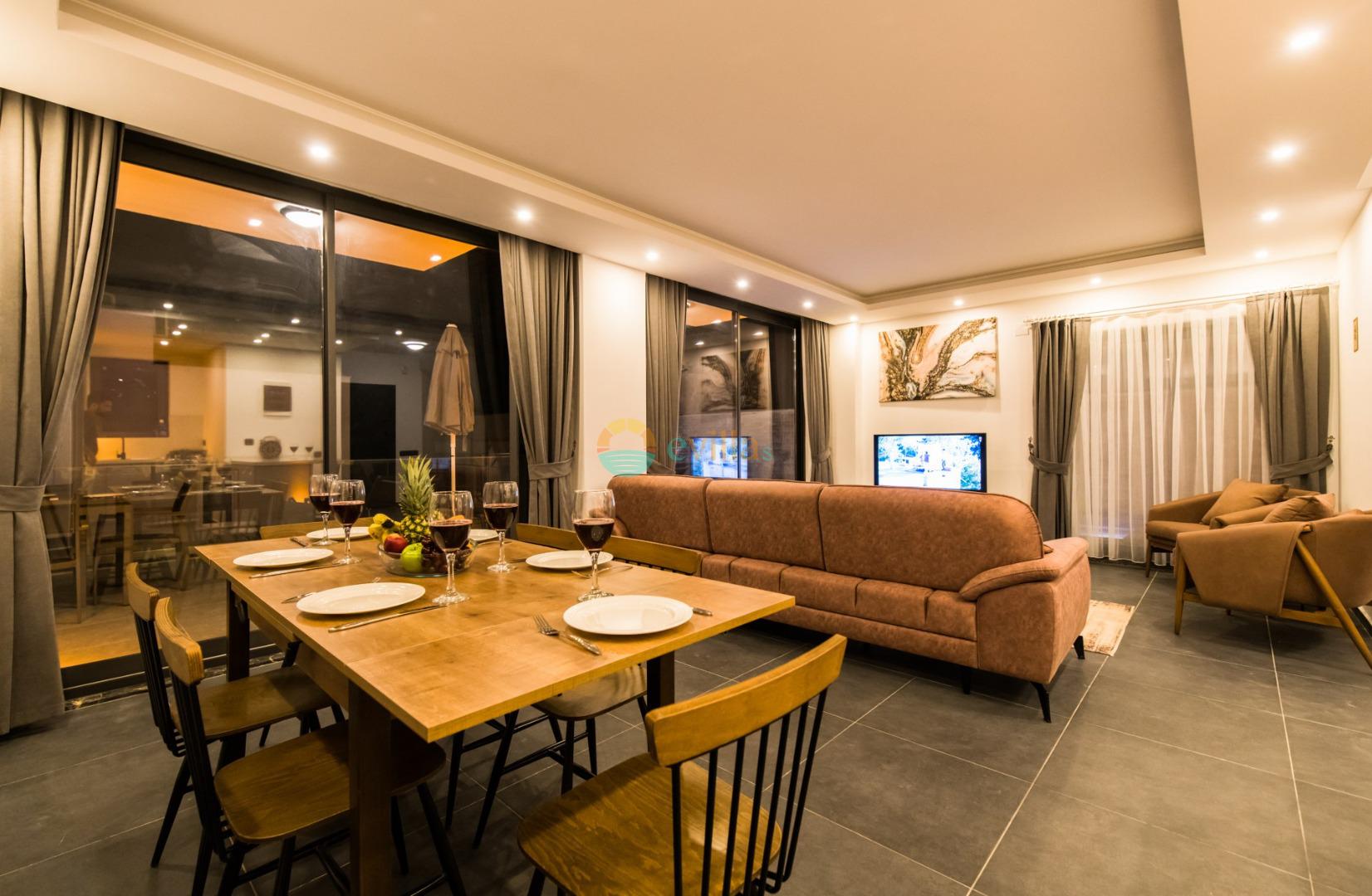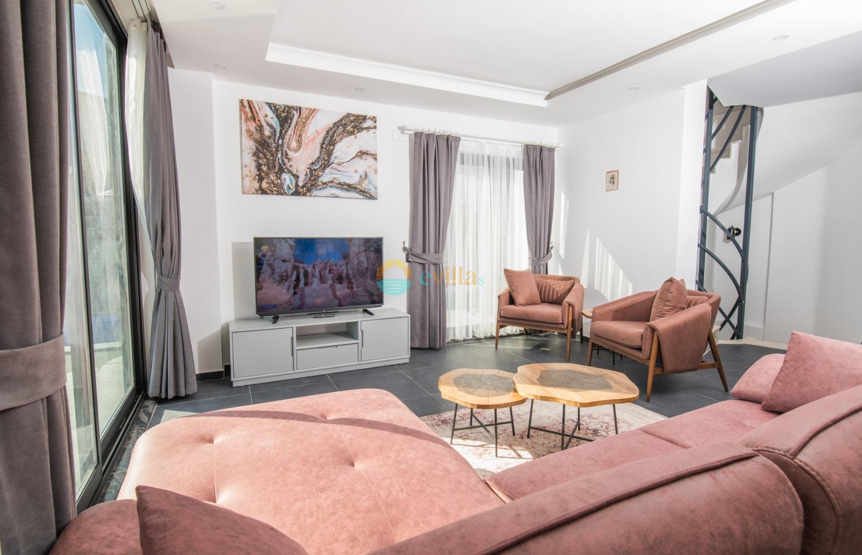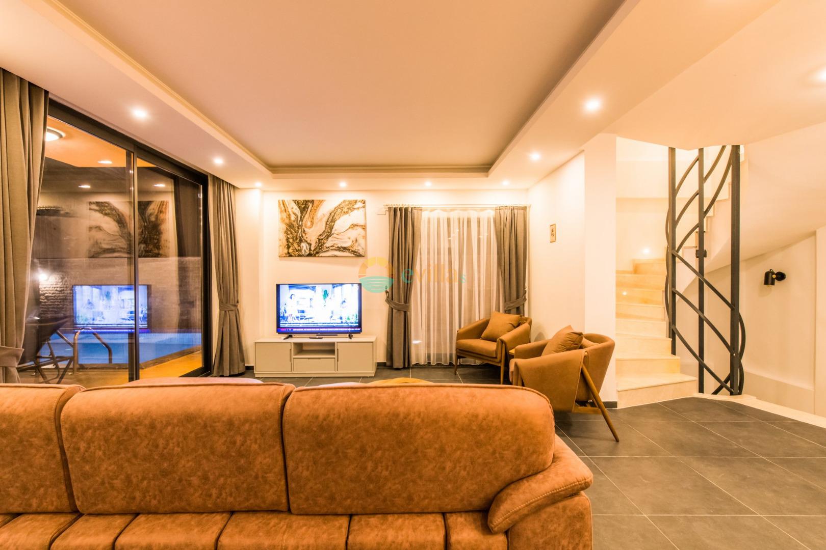 Das Wohnzimmer mit Aussicht verfügt über eine gemütliche Sitzecke, TV, Klimaanlage, Couchtisch und DVD-Player. Vom Wohnzimmer gibt es einen Ausgang zur Poolterrasse.