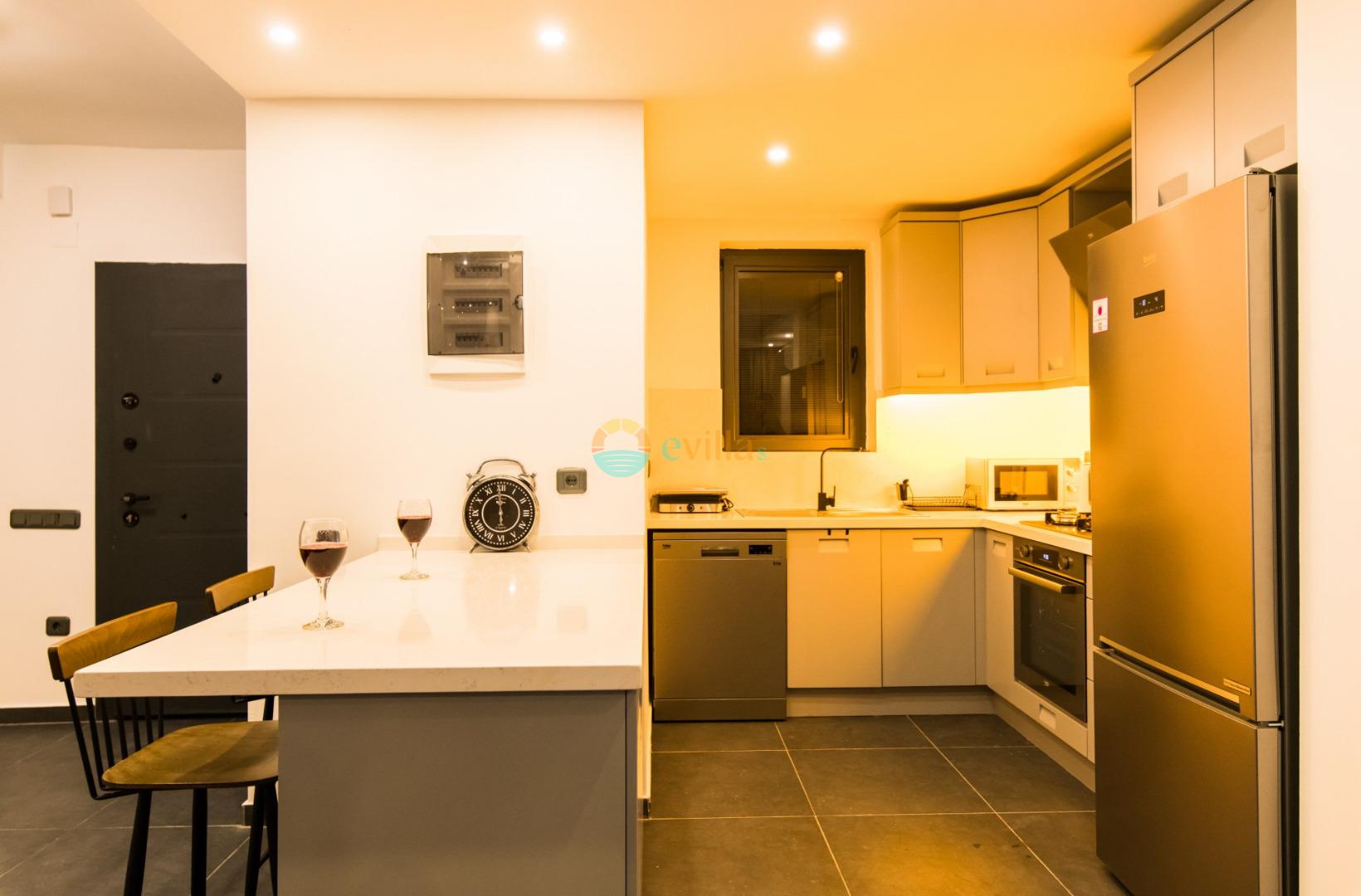 Die komplett ausgestattete, moderne amerikanische Küche verfügt über einen Kühlschrank, einen Geschirrspüler, einen Backofen, einen Herd, eine Mikrowelle, einen Wasserkocher, einen Esstisch, Geschirr, Besteck, Töpfe und Pfannen sowie Gläser.